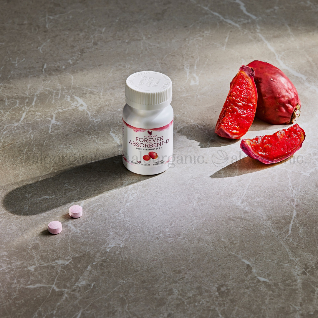 Форевер Absorbent-D® е практичен и вкусен додаток на витаминот D во форма на таблети за џвакање со природен вкус од кактус (приклинг пее). Овој производ е создаден за да ти помогне лесно и секојдневно да внесуваш витаминот D — кој е најчесто недоволен само преку храна или сонце — додека витамин E и антиоксиданс и помага за заштита на клетките и поддршка на здравјето внатре во телото.